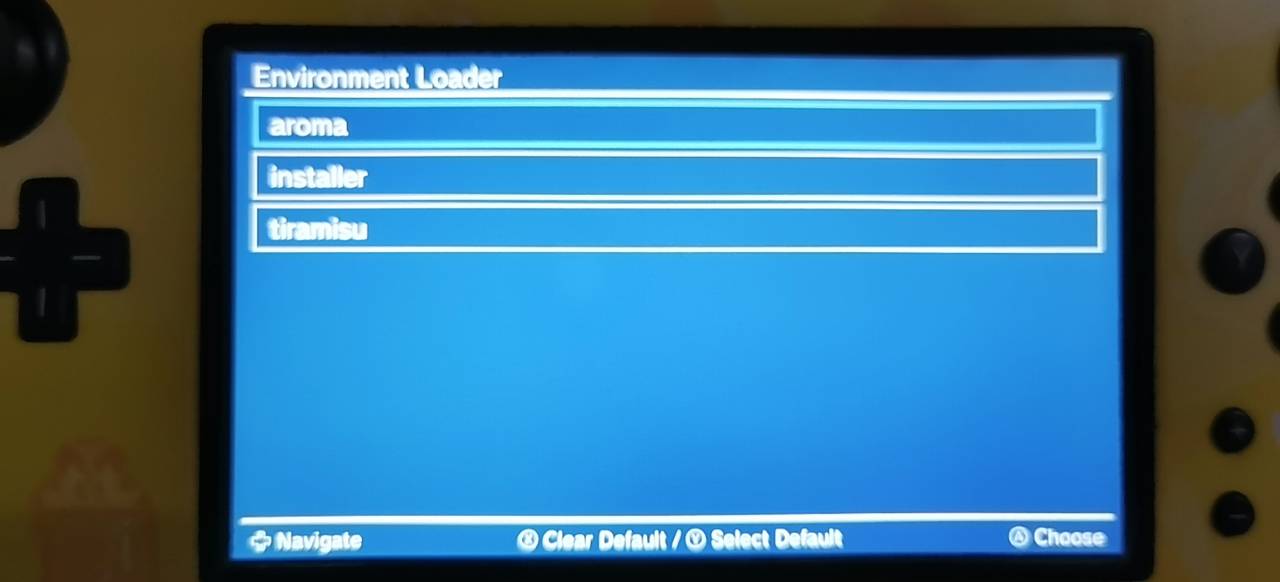 - 将SD卡插入机器后,如果你的机器已经设置了开机启动提拉米苏,则在开机的同时按住X键进入选单选择aroma即可进入阿罗马系统.