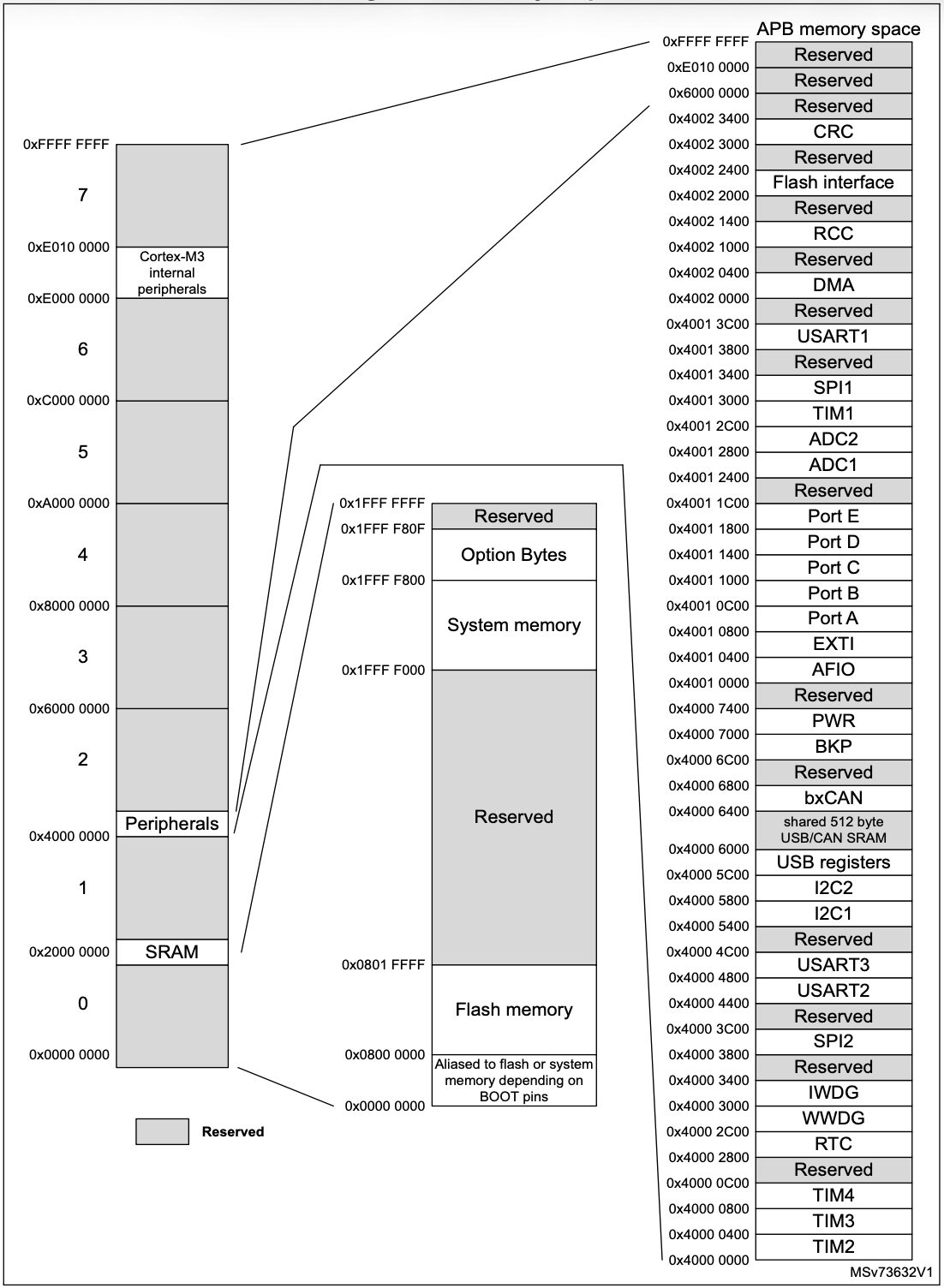 STM32 微控制器没有操作系统提供的复杂的虚拟内存机制,也没有进程的概念。它的内存布局直接对应于其物理内存和片上外设的地址空间。
